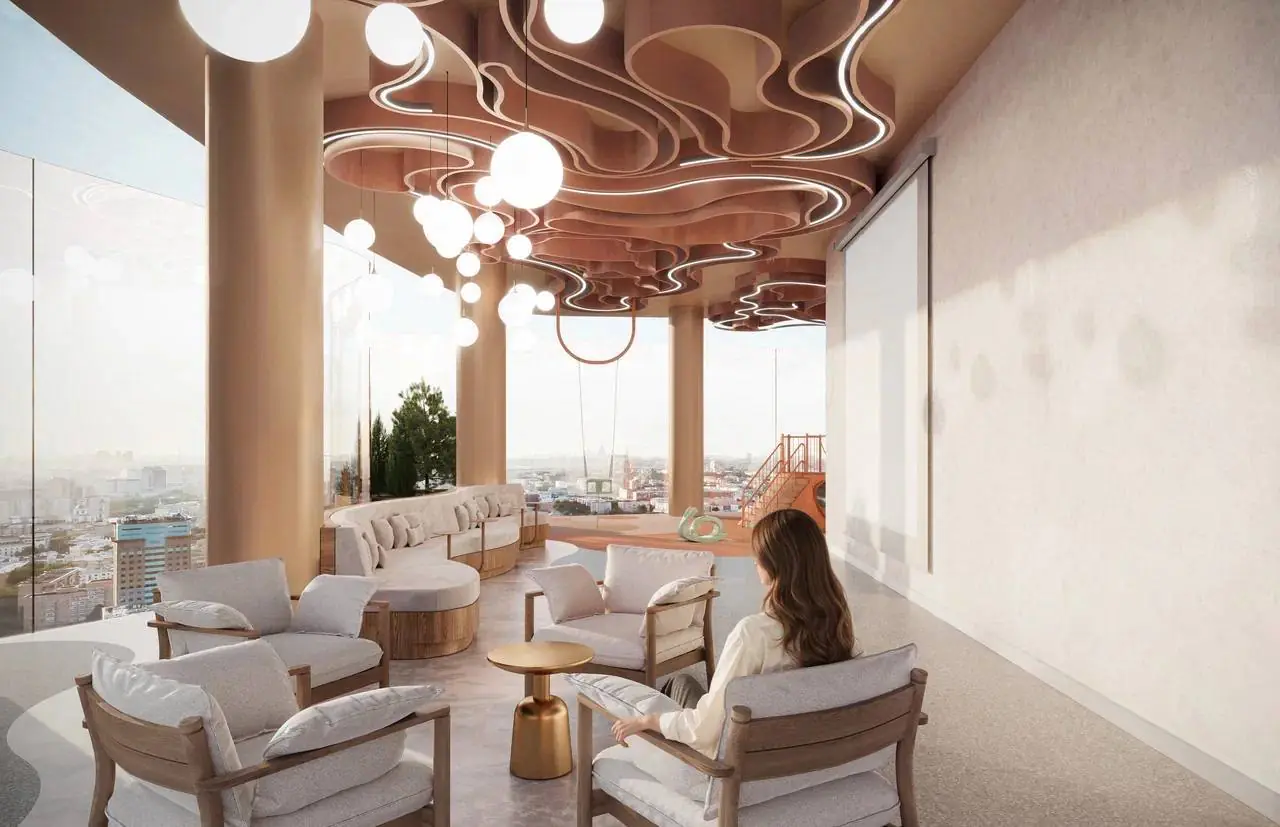 Из интересных фишек – приватный двор с биокамином, водным объектом и живой изгородью, секретный сад на земле, бьюти-комната, игровые зоны для детей разных возрастов, пространства для проведения мероприятий, работы, отдыха и занятий йогой. Значительная часть инфраструктуры предусмотрена на “парящем” мосте на высоте 57 метров.