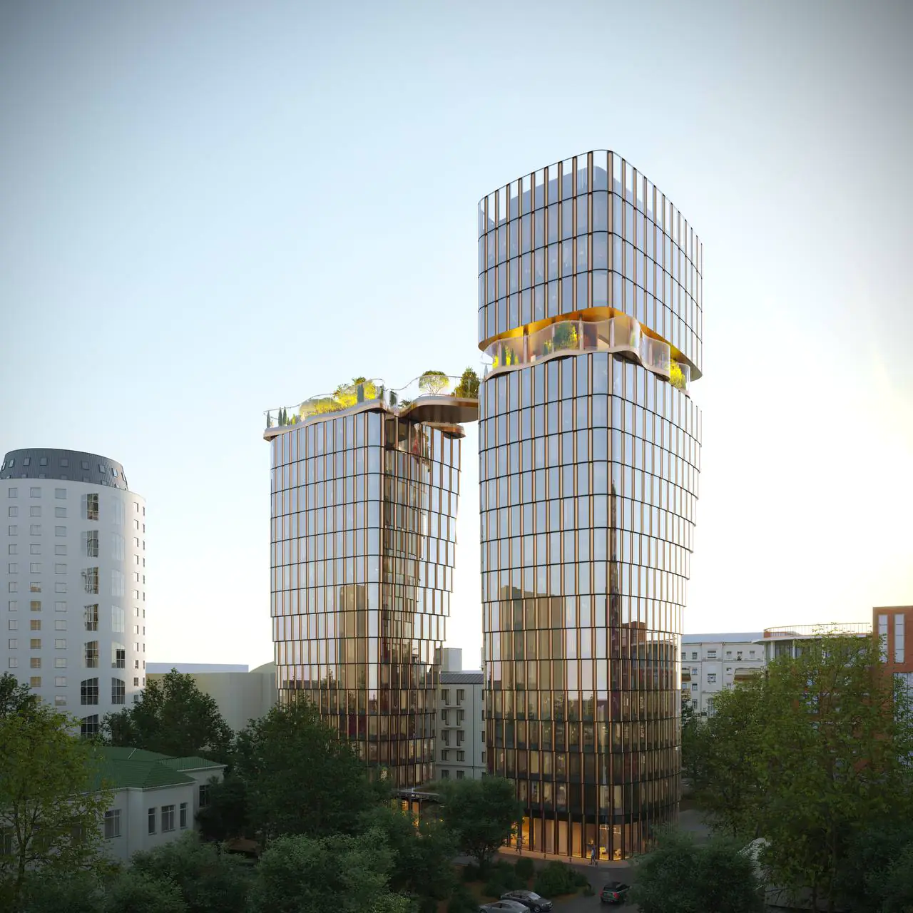 Проект с авторской архитектурой от бюро ADM формирует выразительный силуэт из двух стеклянных корпусов высотой 16 и 19 этажей, соединенных парящим мостом-садом. Фасады выполнят из витражного остекления в сочетании с алюминиевыми анодированными панелями, подчеркивая современный характер и высокотехнологичность объекта.